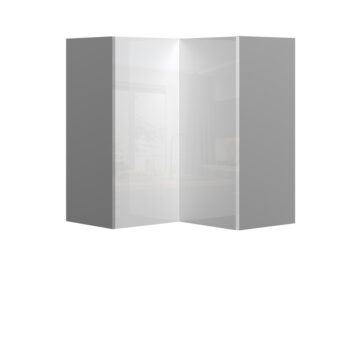 Infinity kuhinja gornji kutni viseći ormarić. Korpus je izrađen od ploče debljine 18 mm u bijeloj boji, a fronte su izrađene od MDF-mediapana i lakirane tehnologijom nanošenja UV laka čime se postiže visoka razina sjaja – 99,70 %.Ova tehnologija omogućuje četiri puta bolju otpornost na fizički udari i trošenje. , kao standardno lakiranje. Sva vrata imaju ugrađen mehanizam za meko zatvaranje.