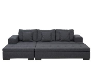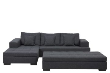 Kauč Bowie je napravljen od Happ tekstila tamno sive boje. Ima crne drvene nogice. Kauč uključuje tri jastuka i tabure. Možete birati između lijeve i desne postave.