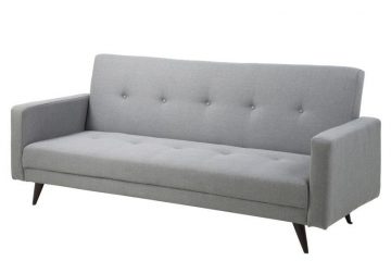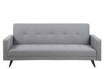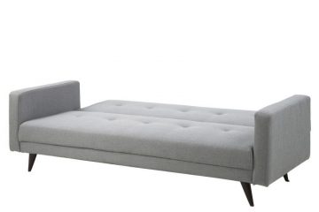 Kauč Leconi je napravljen od Corsica tkanine svijetlo sive boje. Ima ukrasne gumbe i drveno podnožje tamno smeđe boje.