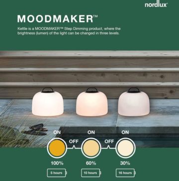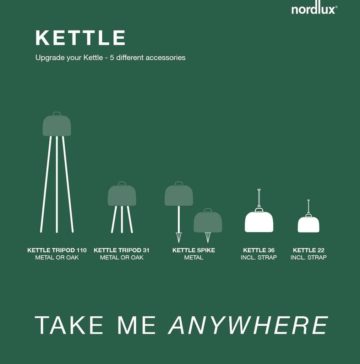 Mogućnosti serije Kettle su bezbrojne, jer sa pomoću izmjenjivog pribora možete odrediti vrstu svjetiljke, koju želite (prikazano na slikama). Dizajn i funkcionalnost pažljivo su promišljeni, tako da serija lijepo osvjetljava vaš svakodnevni život – i iznutra i izvana. Kettle nije samo ukrasno, već pruža i dobru svjetlost, a istovremeno možete podesiti svjetlinu na tri razine. Ugrađena baterija traje do pet sati, kada svjetiljka radi sa punom snagom. Bateriju možete jednostavno napuniti sa priloženim USB kabelom.