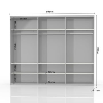 Drsni garderobni ormar s ogledalom Kalla Opera PK281-OG moderan je i funkcionalan komad namještaja iz kolekcije spavaćih soba Opera, koji nudi obilje prostora za organiziranu pohranu. S dimenzijama 272 cm širine, 224 cm visine i 61 cm dubine, uključuje troja klizna vrata, devet polica i tri garderobne šipke, što omogućuje praktično pohranjivanje. Soft mat UV lak u boji kašmira na vratima, stranicama i frontama osigurava profinjen izgled, dok Hettich okovje i soft-close mehanizam jamče dugotrajnu i udobnu uporabu.