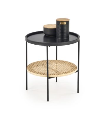 Okrugli stolić za dnevni boravak Kampa ima ploču izrađenu od laminiranog medijapana. U donjem dijelu ima policu od prirodnog ratana, koja je izvrsna za spremanje knjiga i časopisa. Podnožje je jednostavnu i elegantnu od prašno lakiranog čelika u crnoj boji.