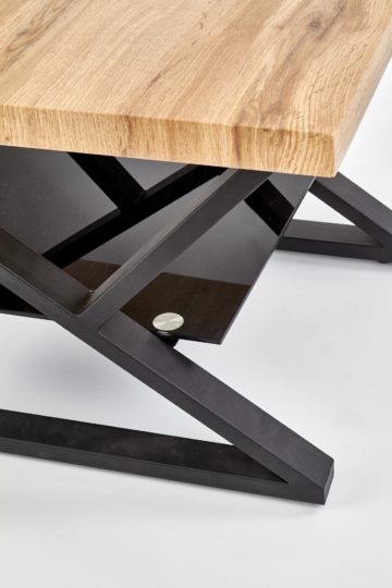 Klub stol Xena ima lijep dizajn. Ploča je četvrtastog oblika i izrađena je od laminiranog mediapana. Ovaj je u boji zlatnog hrasta, a elegantno dizajnirano podnožje izrađeno je od prašno lakiranog čelika u crni boji.