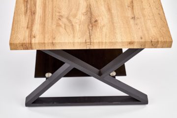 Klub stol Xena ima lijep elegantan dizajn. Ploča je pravokutnog oblika i izrađena je od laminiranog mediapana u boji zlatnog hrasta. Elegantno dizajnirano podnožje izrađeno je od prašno lakiranog čelika u crni boji.