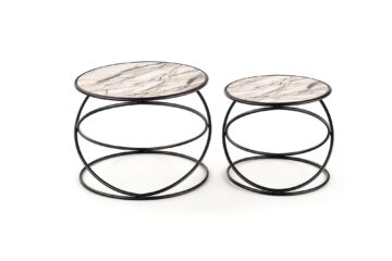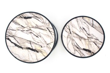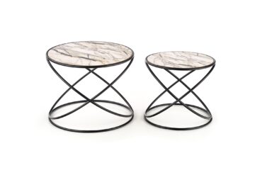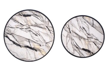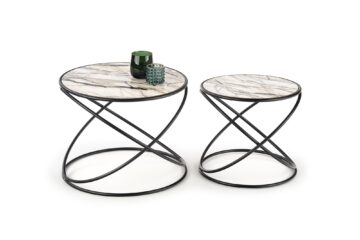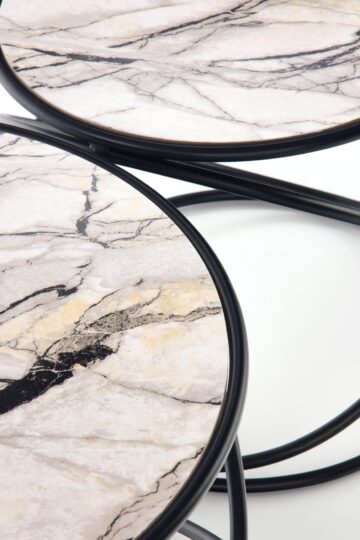 - Boja: Ploča stolića je obrađena u imitaciju bijelog mramora, što daje elegantan i profinjen izgled. Kontrastna crna boja čelične baze stvara moderan i estetski privlačan izgled koji se može lijepo uklopiti u različite dekorativne stilove.