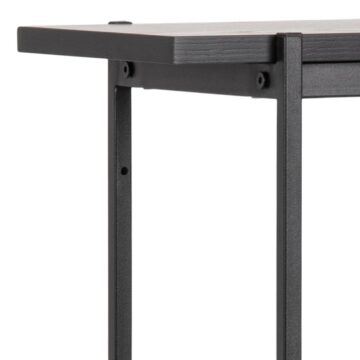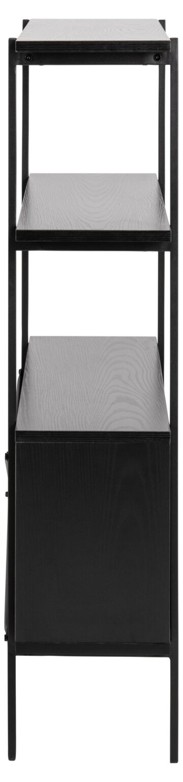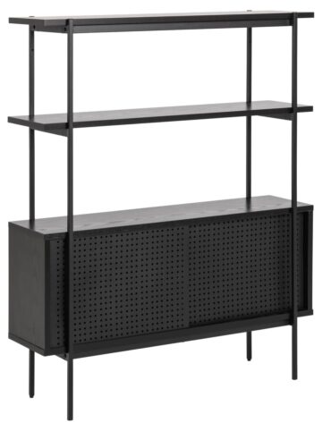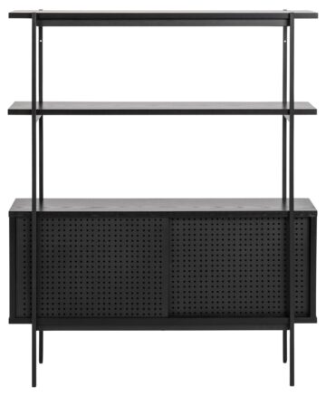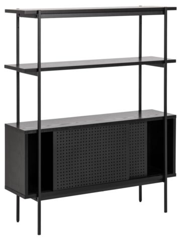 Knjižna polica Angus savršeni je izbor za moderne interijere, jer spaja čiste linije i laganu strukturu s modernim industrijskim prizvukom. Izrađena je od čelika s crnim praškastim premazom i polica od melamina u izgledu crnog pepela. Polica uključuje klizna vrata s rešetkom, koja omogućuju diskretno pohranjivanje predmeta koje želite sakriti.