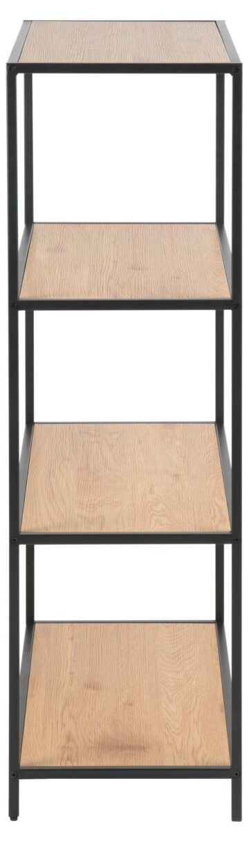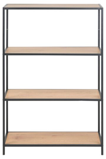Knjižna polica Seaford spaja prostranost i jednostavnost s zanimljivim dizajnom, čime se ističe u vašem prostoru. Izrađena od crnog prašno lakiranog čelika, polica nudi čvrstu konstrukciju, dok tri police u izgledu divljeg hrasta dodaju rustikalni šarm. Ova polica je skromna, ali učinkovita, jer bez napora ističe vaš stil.