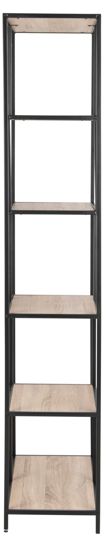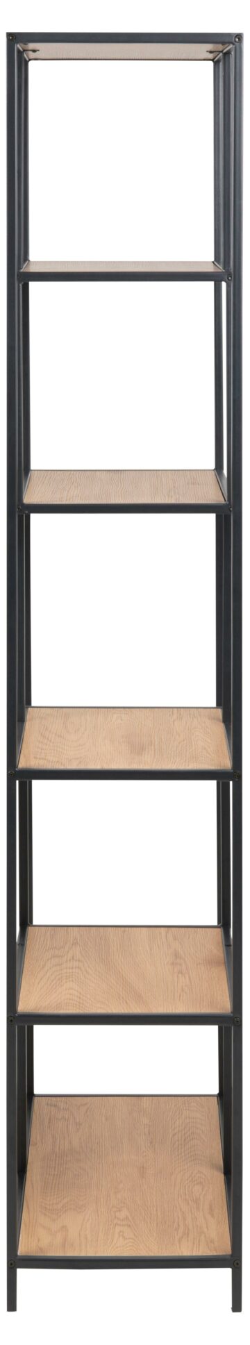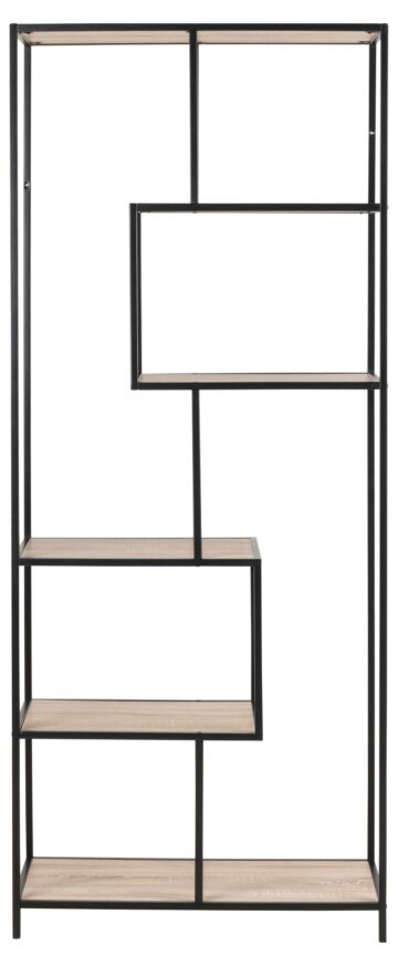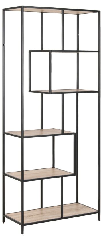 Regal za knjige Seaford sadrži 4 manje police i jednu veču na dnu. Njegova posebnost je zasigurno asimetrija u raspoređenju polica unutar metalnog i prašno lakiranog crnog okvira. Jake police sastavljene su iz rafinirane iverne ploče koja je zaščtićena sa zaštitnom folijom u 3 nijanse među kojima možete birati. Na odabir su nijanse divljeg hrasta, nijansa sonome hrasta i nijansa crnog jasena.