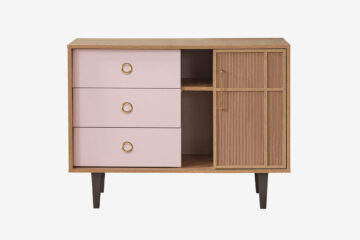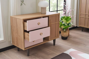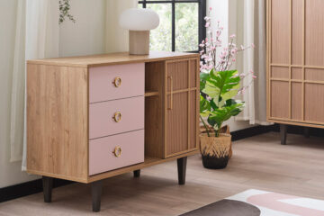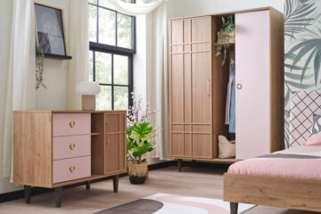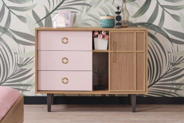 Komoda iz kolekcije Ana osmišljena je kao multifunkcionalni komad namještaja koji spaja estetiku i praktičnost za korištenje u dječjim i mladenačkim sobama. Svojim dizajnom prilagođen je suvremenim potrebama organizacije i skladištenja, a ujedno pridonosi ugodnom i toplo uređenom prostoru.