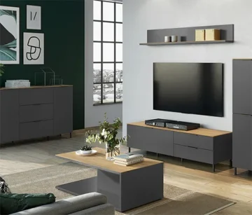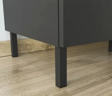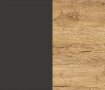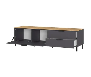 Boja komode je grafitna koja savršeno pristaje uz repliku pokrovne ploče od navarskog hrasta, dok crne ručke i nogice dodatno naglašavaju elegantan izgled.