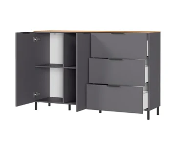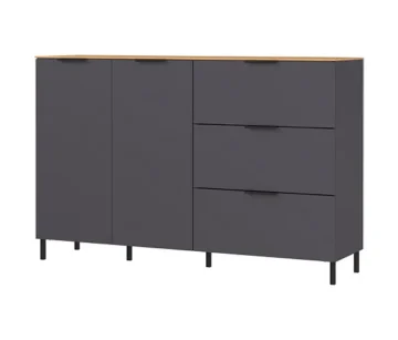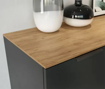 Boja komode je grafitna, koja savršeno pristaje uz repliku ploče od navarskog hrasta, dok crne ručke i nogice daju završni pečat cjelokupnom izgledu.