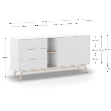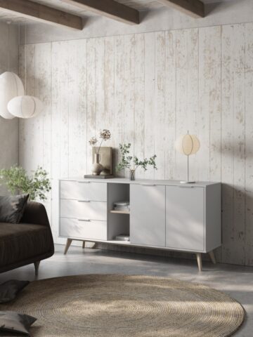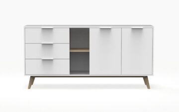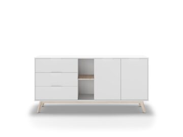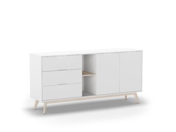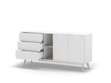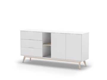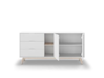 Lakirani MDF korpus komode CAMPUS nudi obilje prostora za pohranu u ladicama i na policama. Postolje od borovog drva stvara atraktivan kontrast i uklapa se u moderne i klasične interijere. Komoda CAMPUS odličan je izbor za pohranu u dnevnom boravku, spavaćoj sobi, dječjoj sobi ili uredu. Zahvaljujući jednostavnom dizajnu, lako se uklapa u različite stilove uređenja. Funkcionalna konstrukcija s ladicama i policama omogućuje organizirano spremanje različitih predmeta.