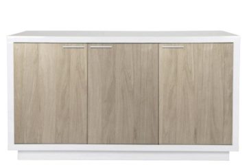 Komoda Chano sastavljena je od iverala koji je zaštićen melaminom visokog sjaja. Dostupna je u bijeloj boji i u kombinaviji bijele i hrasta. Uključuje troja vrata i jednu ladicu.