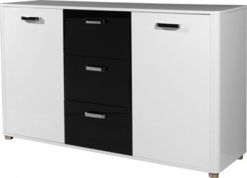 Komoda Dual 3417 ima dimenzije 144 x 84 x 40 cm. Sadrži dvoja vrata i tri ladice. Ladice je moguće izvući do kraja vodilica. Fronte su lakirane bijelom i crnom bojom visokog sjaja.