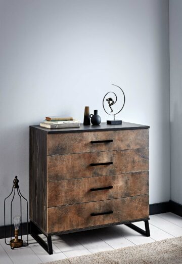 Komoda Kozmos odlikuje se elegantnim spojom drva i metala. Prostran i suvremen dizajn uključuje četiri ladice na mehanizam tihog zatvaranja. Izrađena je od oplemenjene iverne ploče, zaštičene ABS rubnom trakom.