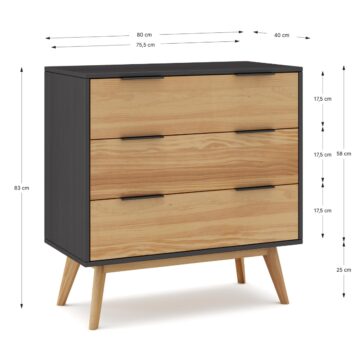 Komoda LAVIS izrađena je od masivnog bora i nudi dovoljno prostora za pohranu. Zahvaljujući klasičnom dizajnu, lako se uklapa u različite stilove uređenja. Prikladna je za spavaću sobu, dnevni boravak ili predsoblje. Kombinacija masivnog bora s crnom ili prirodnom bojom stvara ugodan i topao izgled.