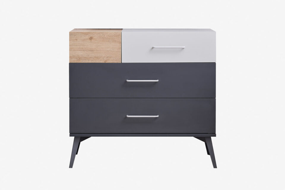 Komoda Pax iz kolekcije soba za mlade dizajnirana je s elegancijom i funkcionalnošću te nudi prostran i uredan prostor za pohranu u estetski dopadljivom pakiranju. S dvije velike i jednom malom ladicom s mehanizmom za lagano zatvaranje, ova komoda omogućuje jednostavno i tiho korištenje, a istovremeno pruža dovoljno prostora za odlaganje odjeće, posteljine ili drugih osobnih stvari.
