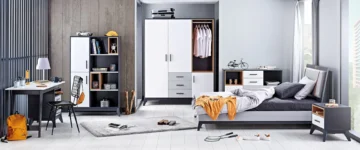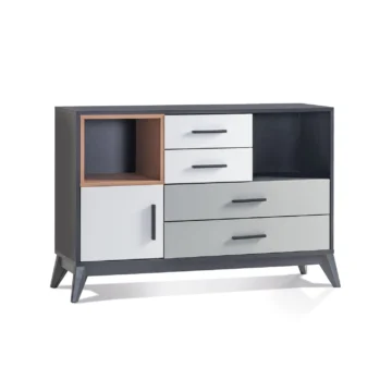Komoda Saja odlikuje se elegantnim spojom sive, bijele, crne i roza boje. Prostran i suvremen dizajn uključuje više ladice te vrata, djelujuća na mehanizam tihog zatvaranja. Izrađena je od oplemenjene iverne ploče, zaštičene ABS rubnom trakom.