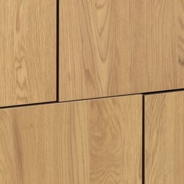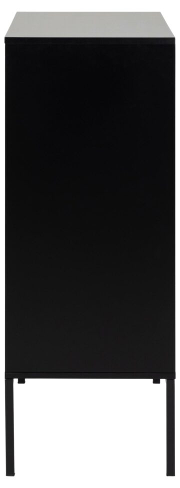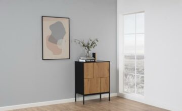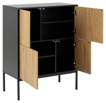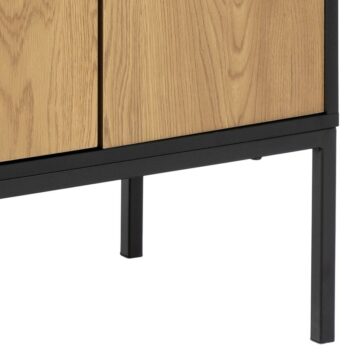 Komoda Seaford napravljena je iz MDF-mediapana, lakiranog u mat crnu boju. Komoda sadrži 4 vrata napravljena iz iverne ploče, koja je dodatno zaštićena sa folijom u nijansi divljeg hrasta. Komoda je postavljena na uzdignuto metalno podnožje. Sa svojim dizajnom crnog okvira i vrata u boji divljeg hrasta prikazuje pravu harmoniju modernog i domačeg stila.