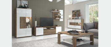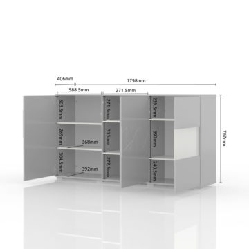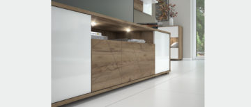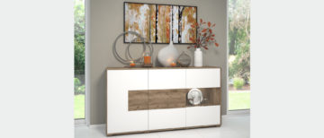 Komoda Stela K3S/ST ima troja puna vrata i jedna u kombinaciji sa kaljenim staklom. Vrata se otvaraju sa dodirom. Unutra je šest polica. Tijelo je u boji Tabacco hrasta, a vrata od medijapana su u bijeloj boji, lakirana sa UV lakom, što osigurava 99,70% pokrivenost i otpornost na udarce i ogrebotine.
