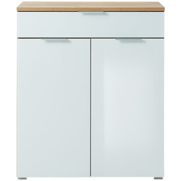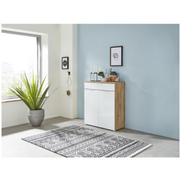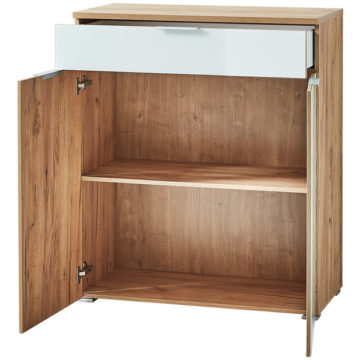 Telde komoda idealna je za uređenje hodnika ali i ostatka prostorija. Fronte su dodatno nadograđene kaljenim staklom koje omogućuje lakše čišćenje, dok metalne ručke osiguravaju lakše otvaranje. Komoda se sastoji od praktične ladice i dvoja vrata iza kojih se krije polica. Svojom kombinacijom boja bijele i navarra hrasta pogodan je za opremanje tradicionalnih i modernih stambenih prostora. Svi rubovi su zaštićeni ABS rubom koji dodatno štiti od oštećenja. Dok su sve ostale površine dodatno zaštićene melaminskim premazom koji dodatno štiti od prljavštine.