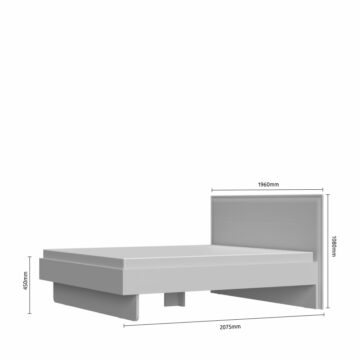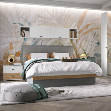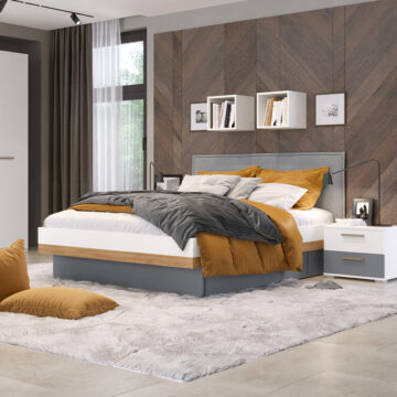 Krevet iz kolekcije ARC karakterizira kombinacija nježno bijelog mat laka i drvenog dekora pacifičkog oraha koji zajedno stvaraju elegantan i moderan izgled. Tamno siva baza dodaje kontrast i vizualnu privlačnost.