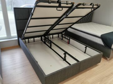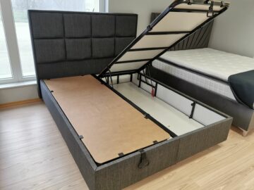 Tapeciran krevet ima podiznu bazu s kvalitetnim mehanizmom i praktičnim ručkama za podizanje te kutiju za odlaganje s otvorima.