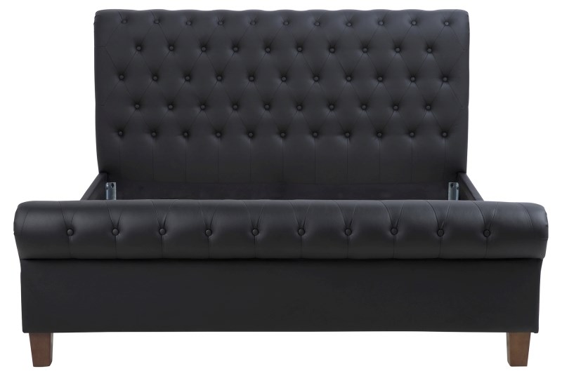 Krevet Cedarville je napravljen od umjetne kože u crnoj boji, nogice kreveta su drvene u smeđoj boji.