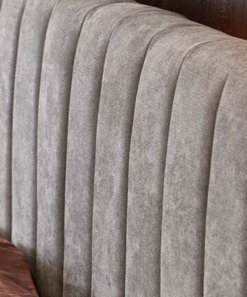 Tapeciran krevet sa podignutim postoljem i tkaninskom navlakom svijetlo sive boje. Estetskog izgleda, sa elegantnim uzglavljem. Izrađena je od tkanine i praškasto lakiranog čelika. Madrac (160 x 200 cm) nije uključen u cijenu.