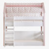 Krevet na kat obojen je u nježno bijelu i ružičastu boju što doprinosi vedroj i veseloj atmosferi dječje sobe.