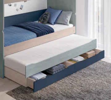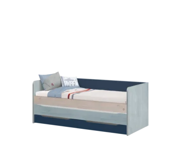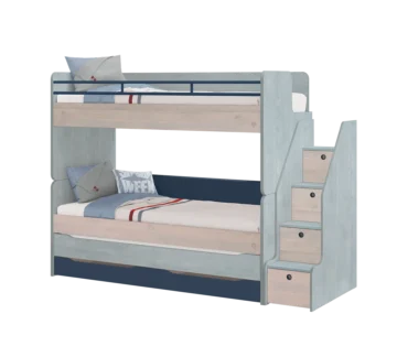 Krevet na kat sa stepenicama Tris u plavo-sivoj kombinaciji boja prikladan je za madrace dimenzija 90 x 200 cm. Krevet na kat sastoji se od tri ležaja – gornjeg, donjeg i kreveta na razvlačenje. Stepenice su smještene na bočnoj strani kreveta i imaju čak četiri ladice, koje pružaju dovoljno prostora za odlaganje stvari. Krevet na kat izuzetno je izdržljiv i siguran. Nosivost svakog kreveta je 130 kg. Posebna prednost ovog kreveta na kat je mogućnost razdvajanja u dva odvojena kreveta, što omogućuje prilagodbu rastućim potrebama djeteta. Površina je zaštićena melaminskim premazom koji učinkovito štiti od ogrebotina i prašine, podnica je uključena, ali madraci i posteljina nisu dio seta.