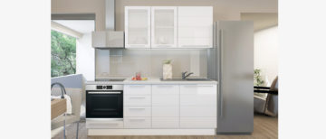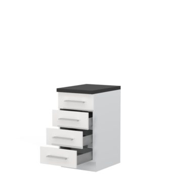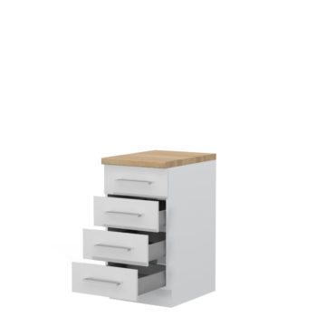 Boja korpusa je bijela. Ladice imaju tiho zatvaranje i Hettich vodilice. MDF fronte su lakirane najnovijom tehnologijom UV lakiranja, čime se postiže visok stupanj sjaja – 99,70%. Ova tehnologija lakiranja pruža četiri puta bolju otpornost na fizičke udare i habanje od standardnog laka. Radna ploča debljine 4 cm može se odabrati između sljedećih boja: