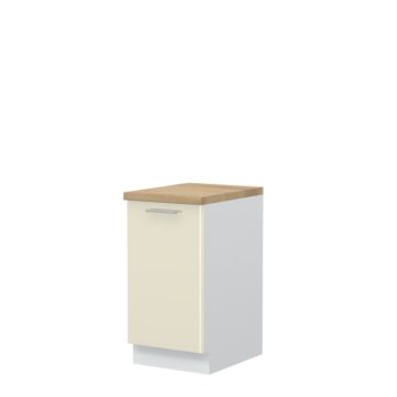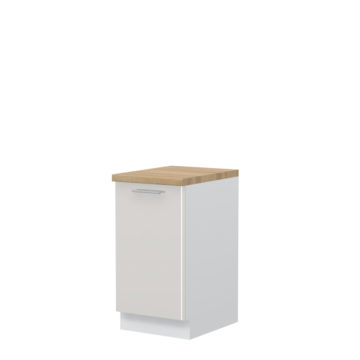 Kuhinjski donji ormarić Modern širine 40 cm ima jedna vrata i dvije police. Vrata imaju tihi mehanizam za zatvaranje i Hettich okove. Izrađena je od pročišćene ploče, debljine 18 mm. Fronte su izrađene od MDF-a i profilirane. Kuhinja je modernog izgleda i čistih linija. Radna ploča i postolje su uključeni u cijenu. Ručke uz nadoplatu.