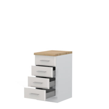 Kuhinjski donji ormarić Modern širine 40 cm ima četiri metal box ladice i izrađena je od pročišćene ploče, debljine 18 mm. Fronte su izrađene od MDF-a i lakirane sa UV tehnologijom i vodilice Hettich. Kuhinja je modernog izgleda i čistih linija. Radna ploča i postolje s brtvom uključeni su u cijenu. Ručke uz nadoplatu.