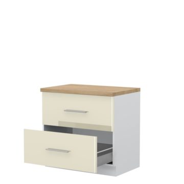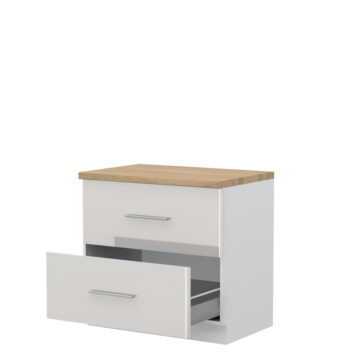 Boja korpusa je bijela. Ladice imaju tiho zatvaranje i vodilice Hettich. MDF fronte lakirane su najnovijom UV tehnologijom lakiranja, sa kojom postižu visoku razinu sjaja – 99,70%. Ova tehnologija lakiranja pruža četiri puta bolju otpornost na fizičke udare i habanje od standardnog laka. Možete birati između radne ploče debljine 4 cm u sljedećim bojama: