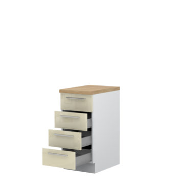 Kuhinjski element širine 40 cm ima četiri ladice i meko zatvaranje. Fronte su lakirane najnovijom tehnologijom UV lakiranja s kojom postižu visok stupanj sjaja – 99,70%. Ova tehnologija lakiranja pruža četiri puta bolju otpornost na fizičke udare i habanje od standardnog laka. Radna ploča debljine 4 cm može se odabrati između sljedećih boja: