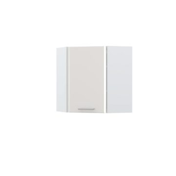 Kuhinjski gornji kutni ormarić Modern izrađen je od pročišćene ploče debljine 18 mm, bijele boje. Ima jedna vrata, koja su na uglovima zaobljena i dvije police. Vrata imaju mehanizam za mekano zatvaranje. Fronte su izrađene od MDF-medijapana i UV lakirane.