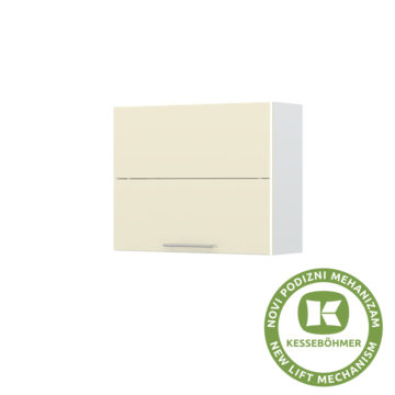 Kuhinjski donji viseči ormarić Modern ima MDF fronte, u više boja. Izrađen je od pročišćene ploče, debljine 18 mm, bijele boje. Ormarić ima jednu policu i dva krila vrata, koja imaju zaobljene rubove i mehanizam za mekano zatvaranje. Fronte su lakirane sa UV tehnologijom. Ormarić je širok 90 cm i visok 72 cm. Ručke uz nadoplatu.
