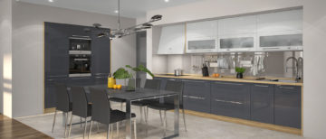 Ručke uz nadoplatu. MDF fronte su lakirane sa najnovijom UV tehnologijom lakiranja, koja postižu visok stupanj sjaja – 99,70%. Ova tehnologija pruža četiri puta bolju otpornost na fizičke udarce i habanje od standardnog lakiranja.