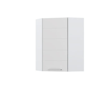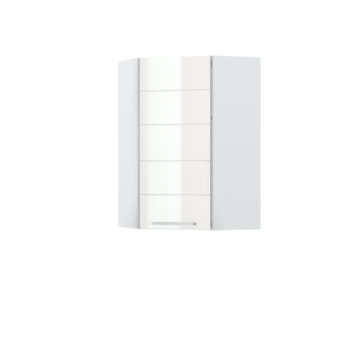Kuhinjski viseči kutni ormarić Highline, dimenzija 64 x 64 i visine 91 cm. Izrađen je od iveral ploče debljine 18 mm, boja korpusa je bijela. Ormarić ima vrata i dvije police unutra. Sva vrata imaju ugrađeni mehanizam mekanog zatvaranja. Fronte su izrađene od MDF-medijapana i UV lakirane.