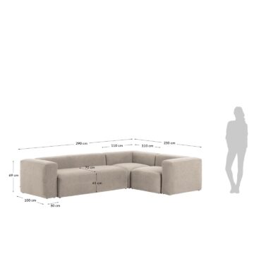 Kutna garnitura Blok u bež boji – 290 x 230 cm ili 230 x 290 cm dostupna je u dvije dimenzijske varijante, što omogućuje prilagodbu različitim prostorima. Visina sjedišta od 41 cm i dubina od 70 cm pružaju udobno sjedenje, dok široki nasloni za ruke visine 69 cm nude dodatnu potporu i komfor.