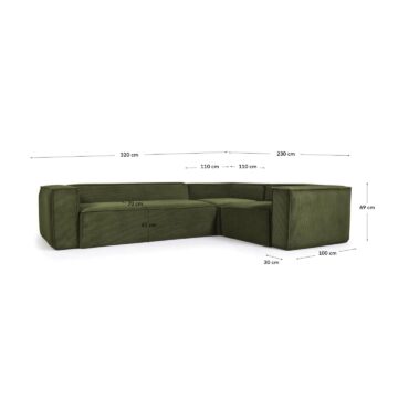 Kutna garnitura Blok u zelenoj boji – 320 x 230 cm ili 230 x 320 cm dostupna je u dvije dimenzijske varijante, što omogućuje prilagodbu svakom prostoru. S visinom sjedišta od 41 cm i dubinom od 70 cm pruža ugodno sjedenje, dok široki nasloni za ruke visine 69 cm nude dodatnu udobnost.