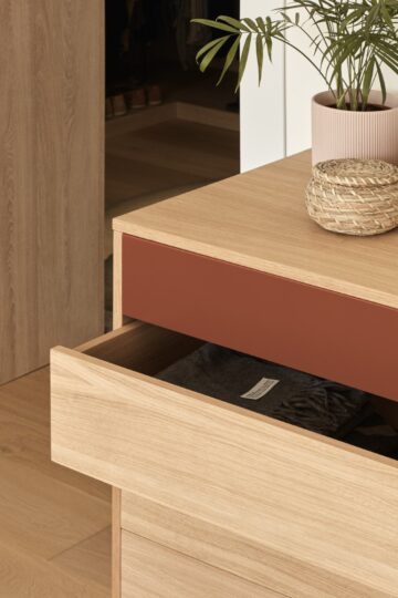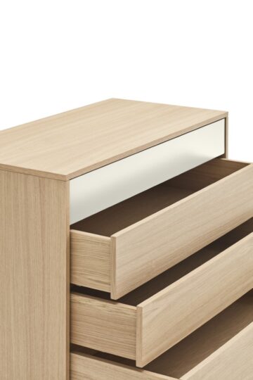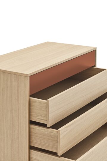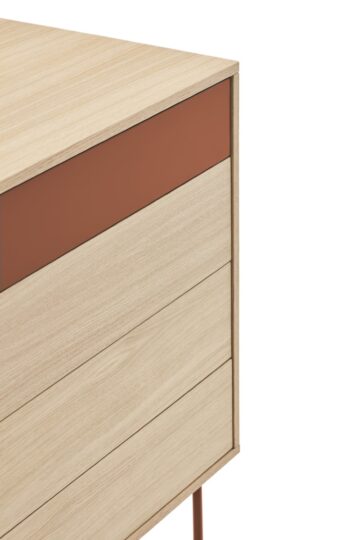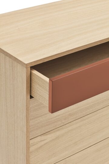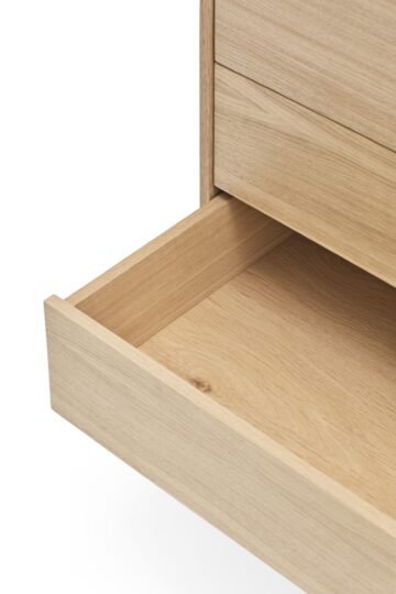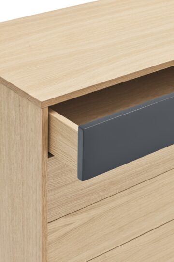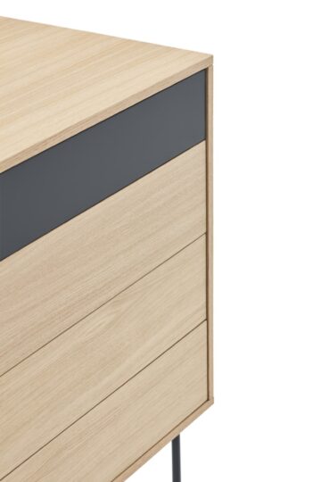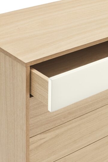 - Materijali: Komoda je u potpunosti izrađena s prirodnim hrastovim furnirom, dok je prvi ladica izrađena od lakiranog mat MDF-a.