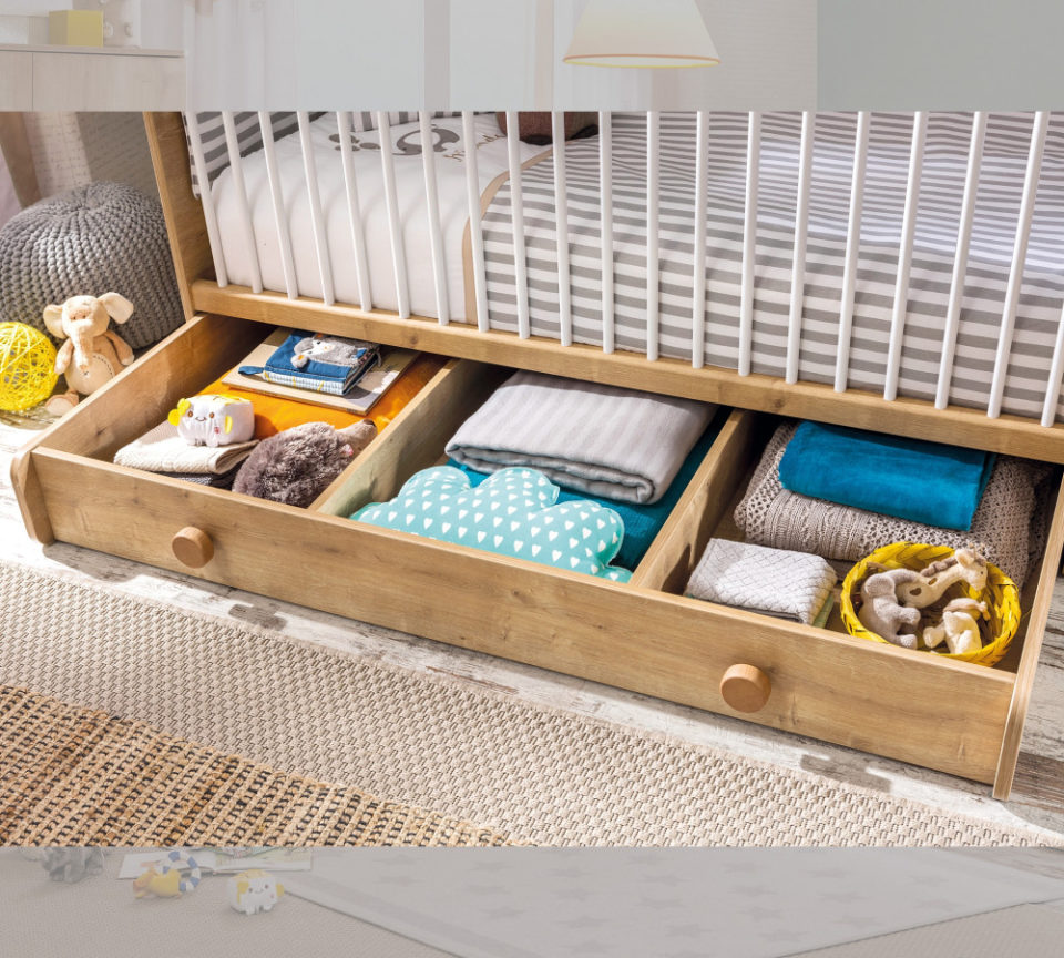 Ladica za izvlačenje Mocha Baby je podijeljena u tri odjeljka, koji olakšavaju organiziranje odjeće za bebe i drugih stvari. Ladica ima instalirane kotače za lako kretanje.