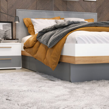Ladica za krevet FK70/AR može se pohvaliti elegantnom prednjom stranom lakiranom UV lakom, koja stvara nježni mat efekt u sivoj boji. UV lak ne samo da pruža estetsku savršenost, već i četiri puta veću otpornost na fizička oštećenja u odnosu na standardni sivi lak, čime se povećava postojanost i vijek trajanja proizvoda.