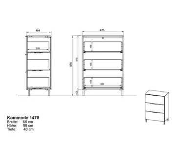 Dimenzije ladice su Š 68 x V 98 x D 40 cm, a unutarnje dimenzije ladica su približno Š 60 x V 16 x D 34 cm.