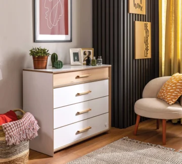 Osim toga, Modera komoda dizajnirana je tako da mladi ljudi mogu izložiti svoje osobne stvari, poput sitnica i fotografija, čime ističu svoj osobni stil. S drvenim ručkama od bukve i oraha, komoda stvara elegantan i atraktivan izgled u mladenačkim sobama.