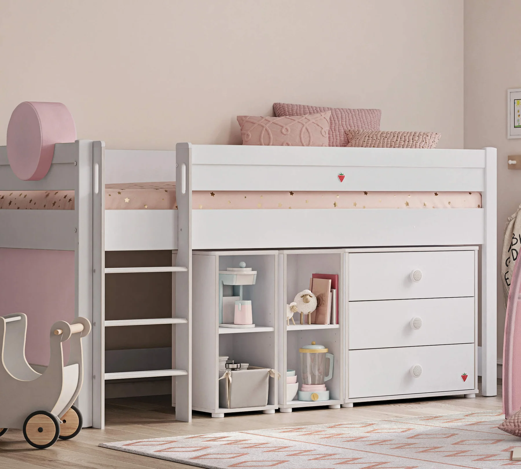 Bijela mala komoda Montes, dizajnirana posebno za vaše dijete, privlači pozornost svojim funkcionalnim dizajnom koji se sastoji od tri ladice. Prva ladica u koju možete posložiti bebine osobne stvari poput čarapica i čizmica je podijeljena, dok sve ladice imaju meko zatvaranje. Posebne obložene ručke, dostupne u dva različita uzorka i boje, stvaraju savršenu harmoniju s bijelom komodom. Komodo, koji je dizajniran u skladu s filozofijom Montessori obrazovanja “pomozi mi da to učinim sam”, također se može koristiti ispod Montes visokog kreveta na kat.