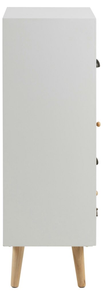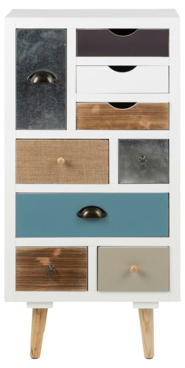Ladičar Thais sastavljen je od 9 ladica raznih boja i asimetričnog razmještaja. Korpus je u bijeloj boji a nogice su izrađene od borovog drveta.