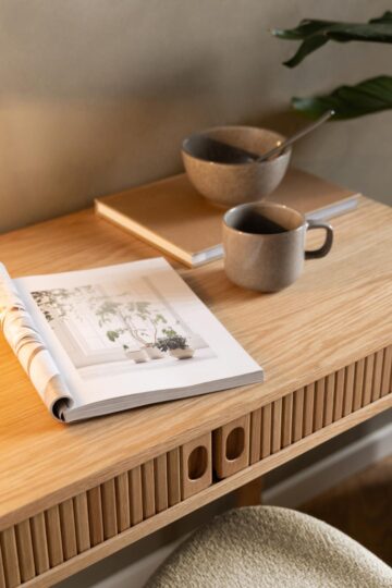 Pisači stol Langley idealan je izbor za moderne radne prostore gdje želite spojiti funkcionalnost i profinjen dizajn. Stol nudi dovoljno prostora za rad, dok tambur vrata omogućuju diskretnu pohranu uredskih potrepština ili dokumenata. Lamelni dekorativni elementi dodaju teksturu i zanimljiv vizualni naglasak koji nadopunjuje prirodni izgled hrastovog furnira.